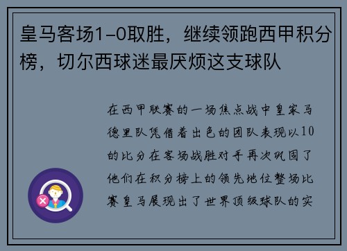 皇马客场1-0取胜,继续领跑西甲积分榜,切尔西球迷最厌烦这支球队