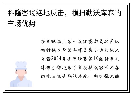 科隆客场绝地反击,横扫勒沃库森的主场优势