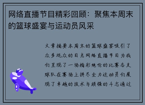 网络直播节目精彩回顾:聚焦本周末的篮球盛宴与运动员风采