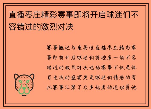 直播枣庄精彩赛事即将开启球迷们不容错过的激烈对决