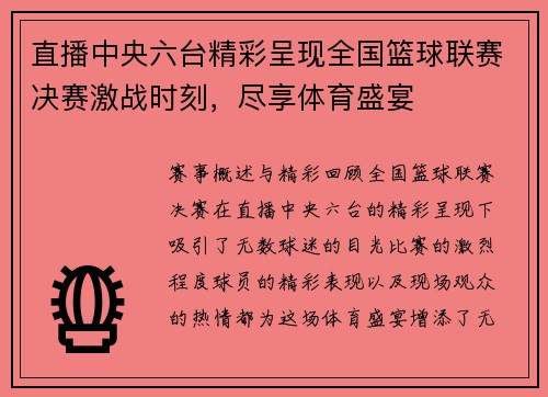 直播中央六台精彩呈现全国篮球联赛决赛激战时刻,尽享体育盛宴